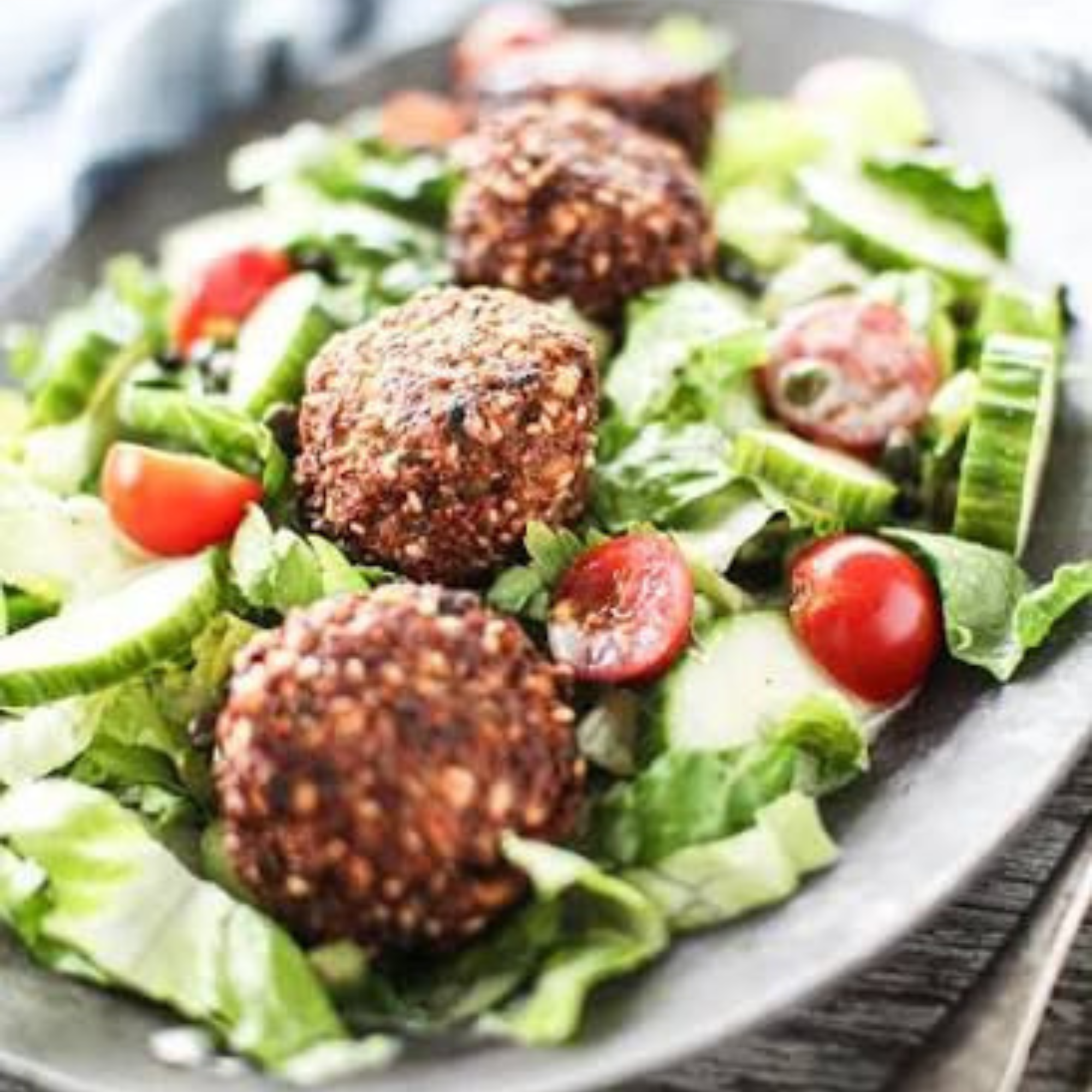 Six falafels served on a plate with hummus and your choice of veggies, with a pita on the side.